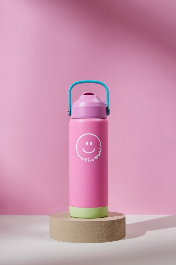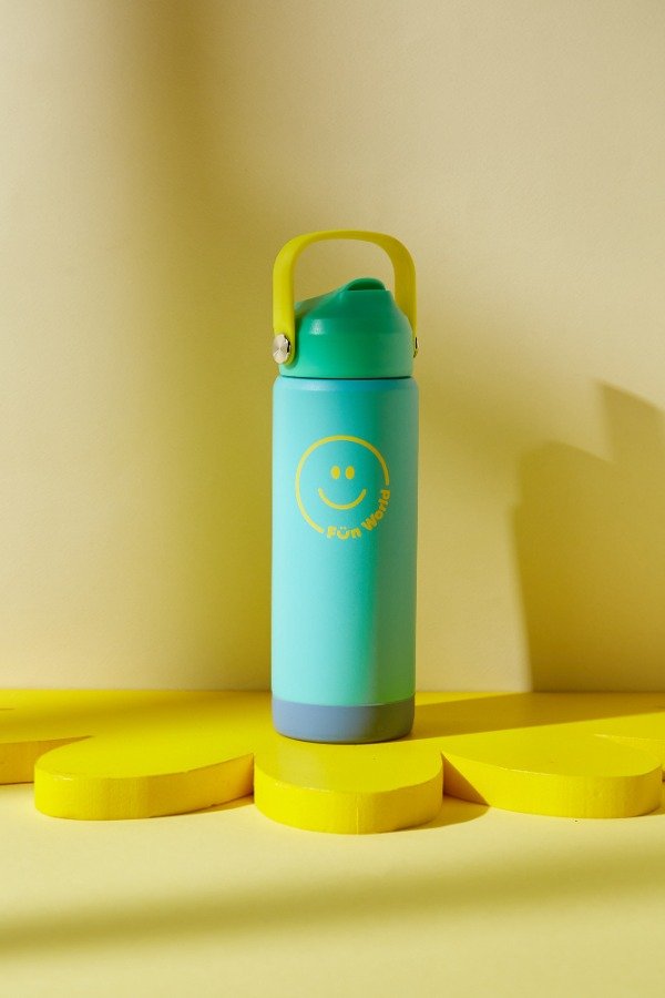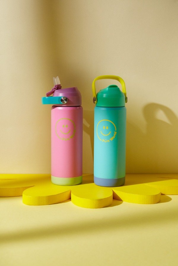 Botella Fun World de acero inoxidable con capacidad de 500 ml,de doble pared con funda de silicona. Mantiene la temperatura hasta por 12 horas, es a prueba de fugas y tiene un pico práctico, ideal para niños. Libre de BPA